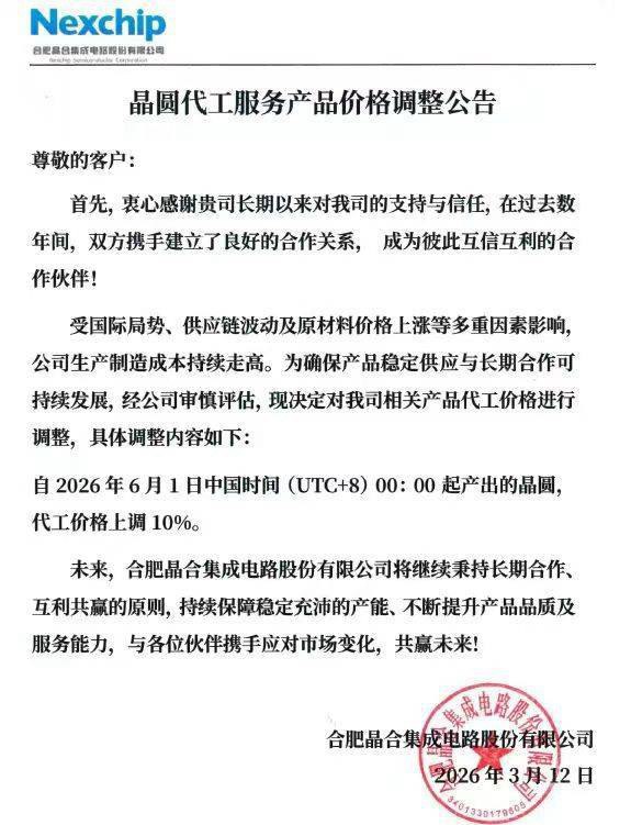 半導體代工產業傳出價格調整消息!中國知名晶圓代工廠合肥晶合集成(Nexchip)於 2026 年 3 月 12 日正式對外發出「晶圓代工服務產品價格調整公告」,致函給所有合作客戶。