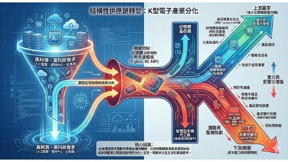 沈萬鈞總結,這波記憶體缺貨正把產業推向K型分化:上游的記憶體本體、企業級儲存、關鍵材料與載板受惠;下游缺乏定價權、受BOM與供給雙擠壓的組裝與品牌端則更艱難。Google提高資本支出更凸顯競局已進入長周期競賽,沒有資源者將被排擠,這不是一兩季的噪音,而是結構轉折的開場。