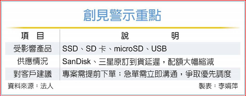 創見強調,已積極與記憶體原廠協調額外配額,但市場供給緊縮程度遠超預期。該公司呼籲客戶,若有現行專案,需提前提出需求;若有急單,務必立即溝通,以便優先調度有限資源。