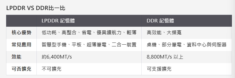 DDR以高效能、大頻寬且能支援擴充見長,常用於桌機、資料中心、伺服器及部分款式筆電;相對的,LPDDR(Low Power DDR)又稱低功耗雙通道同步動態隨機存取記憶體,是在DDR的基礎上發展而來的,目前已發展至LPDDR5X,擁有更快的速率、更高的頻寬與更低的延遲。