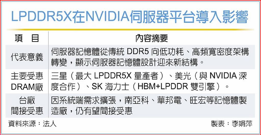 儘管外界擔憂LPDDR進入伺服器將推升成本、加劇缺貨,但對DRAM原廠而言,反而是新一輪記憶體架構升級的最大利多,三星、SK海力士與美光三家預期將因此受惠。